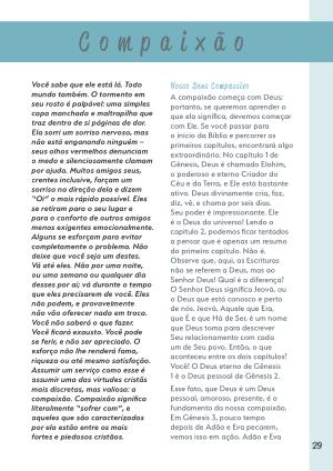 Você sabe que ele está lá. Todo mundo também. O tormento em seu rosto é palpável: uma simples capa manchada e maltrapilha que traz dentro de si páginas de dor. Ela sorri um sorriso nervoso, mas não está enganando ninguém – seus olhos vermelhos denunciam o medo e silenciosamente clamam por ajuda. Muitos amigos seus, crentes inclusive, forçam um sorriso na direção dela e dizem“ Oi” o mais rápido possível. Eles se retiram para o seu lugar e para o conforto de outros amigos menos exigentes emocionalmente. Alguns se esforçam para evitar completamente o problema. Não deixe que você seja um destes. Vá até eles. Não por uma noite, ou uma semana ou qualquer dia desses por aí; vá durante o tempo que eles precisarem de você. Eles não podem, e provavelmente não vão oferecer nada em troca. Você não saberá o que fazer. Você ficará exausto. Você pode se ferir, e não ser apreciado. O esforço não lhe renderá fama, riqueza ou até mesmo satisfação. Assumir um serviço como esse é assumir uma das virtudes cristãs mais discretas, mas valiosa: a compaixão. Compaixão significa literalmente“ sofrer com”, e aqueles que são caracterizados por ela estão entre os mais fortes e piedosos cristãos.