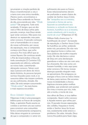 30 arruinaram a criação perfeita de Deus e transformaram o céu e a terra com uma única mordida. Mesmo assim, encontramos o Senhor Deus andando no frescor do dia, procurando por eles.“ Onde estás?” Ele pergunta. Tudo está acabado. O tempo, que um dia verá o Filho de Deus sofrer pelo pecado, avança, mas Deus ainda quer estar conosco. Não para nos destruir ou repreender, mas para estar conosco. O pecado começou com a humanidade e é a causa do nosso sofrimento, por causa da separação, mas a compaixão começa com Deus, que sofre conosco. Por mais difícil que as coisas fiquem, Ele continua sendo o Pai de misericórdias e Deus de toda consolação( 2 Coríntios 1:3), esperando em silêncio, sofrendo ao nosso lado, caminhando abraçado conosco. Talvez você seja a pessoa em dores do início desta história. As pessoas lançam sorrisos forçados para você, e os sussurros deles não trazem conforto ao seu sofrimento. Amado, Ele sabe. Ele está sempre sussurrando:“ Onde estás?” da mais baixa e mais espessa escuridão.